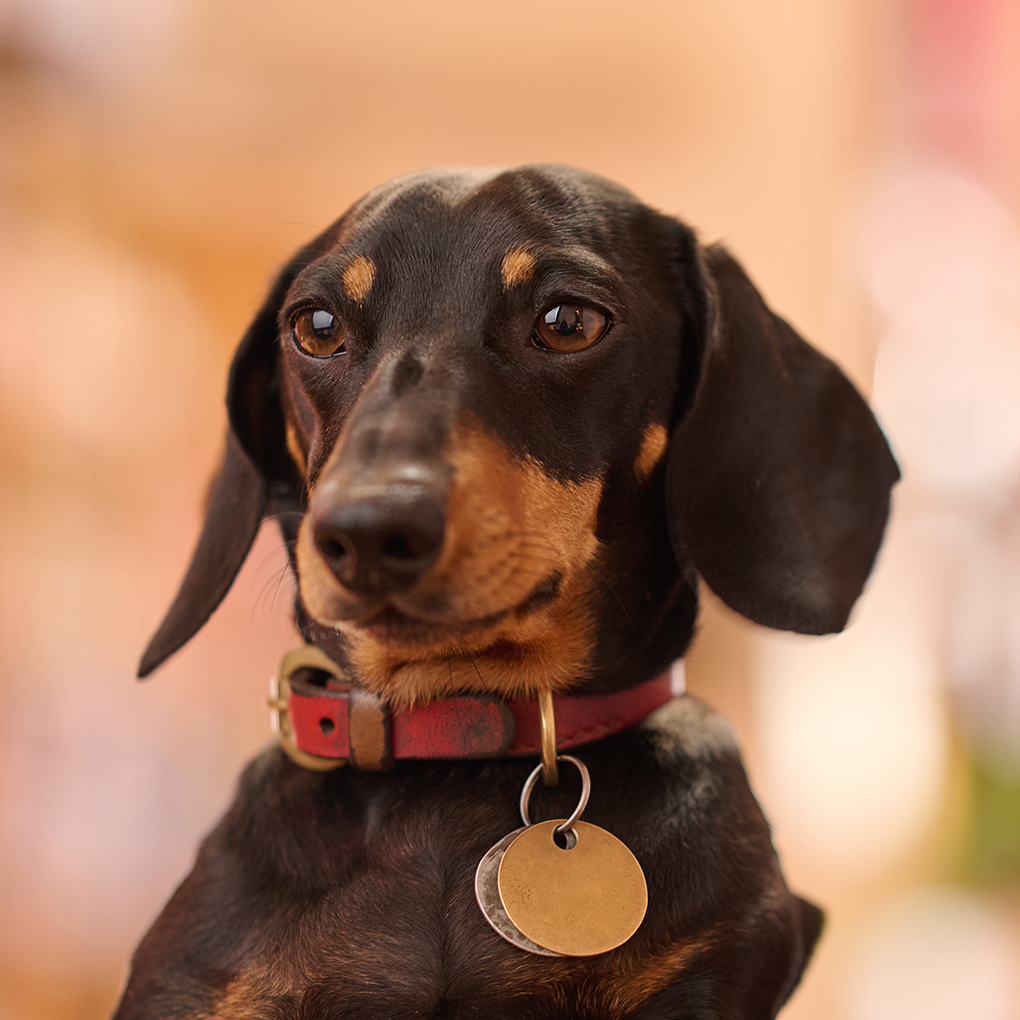 A tall leader with a tiny dachshund.